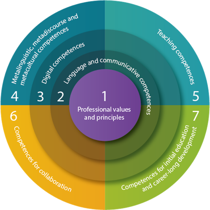 Das Kompetenzmodell besteht aus sieben Dimensionen. Dimension 1 beinhaltet professionelle Werte und Prinzipien für die Rolle der Sprache in allen Fächern. Sprachlich-kommunikative Kompetenzen sowie digitale Kompetenzen prägen die Dimensionen 2 und 3, welche die darauffolgenden vier Dimensionen überschneiden, zumal diese Kompetenzen in unterschiedlichen Kontexten aktiviert werden. Dimension 4 bezieht sich auf metalinguistische, metadiskursive und metakulturelle Kompetenzen, die in die methodisch-didaktischen Kompetenzen von Dimension 5 münden. Kollaboration ist Gegenstand von Dimension 6, während Dimension 7 Kompetenzen zur professionellen Entwicklung in der Aus- und Weiterbildung enthält, wozu auch der Umgang mit der mentalen Gesundheit gehört. Die Deskriptoren wurden für Lehrpersonen verschiedener Fächer (darunter Sachfächer oder Fremdsprachen) ausdifferenziert und mit Reflexionsaufgaben für die Lehrpersonenbildung ergänzt.